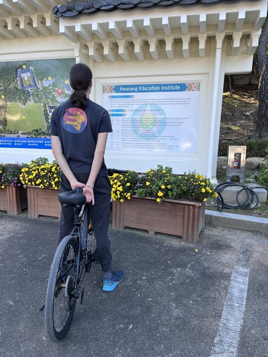Op deze heilige plek werden de Hwarang krijgers opgeleid door monniken. Er werd vooral aan karaktervorming gedaan door gebruikmaking van karatelessen, meditatie, en theeceremonies. Inzet foto: Sven, onze grootste krijger uit Amstelveen (die uiteraard alleen het laatste stuk met de fiets heeft afgelegd).